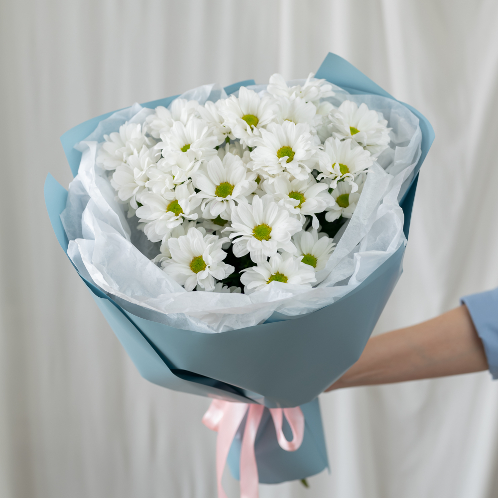 В составе 3 белых хризантем (сорт Бакарди) в дизайнерской упаковке.